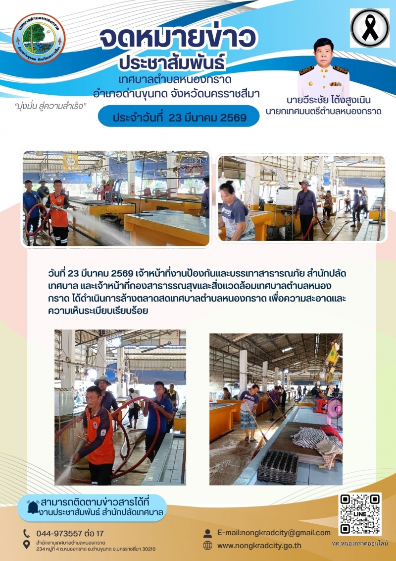 วันที่ 23 มีนาคม 2569 เจ้าหน้าที่งานป้องกันและบรรเทาสาธารณภัย สำนักปลัดเทศบาล และเจ้าหน้าที่กองสาธารรณสุขและสิ่งแวดล้อมเทศบาลตำบลหนองกราด ได้ดำเนินการล้างตลาดสดเทศบาลตำบลหนองกราด เพื่อความสะอาดและความเห็นระเบียบเรียบร้อย