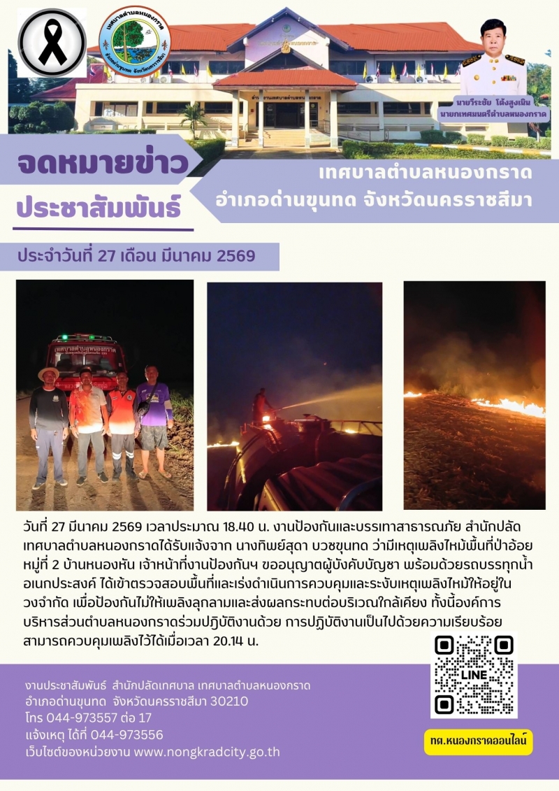 วันที่ 27 มีนาคม 2569 เวลาประมาณ 18.40 น. งานป้องกันและบรรเทาสาธารณภัย สำนักปลัดเทศบาลตำบลหนองกราดได้รับแจ้งจาก นางทิพย์สุดา บวชขุนทด ว่ามีเหตุเพลิงไหม้พื้นที่ป่าอ้อย หมู่ที่ 2 บ้านหนองหัน เจ้าหน้าที่งานป้องกันฯ ขออนุญาตผู้บังคับบัญชา พร้อมด้วยรถบรรทุกน้ำอเนกประสงค์ ได้เข้าตรวจสอบพื้นที่และเร่งดำเนินการควบคุมและระงับเหตุเพลิงไหม้ให้อยู่ในวงจำกัด เพื่อป้องกันไม่ให้เพลิงลุกลามและส่งผลกระทบต่อบริเวณใกล้เคียง ทั้งนี้องค์การบริหารส่วนตำบลหนองกราดร่วมปฎิบัติงานด้วย การปฏิบัติงานเป็นไปด้วยความเรียบร้อยสามารถควบคุมเพลิงไว้ได้เมื่อเวลา 20.14 น.